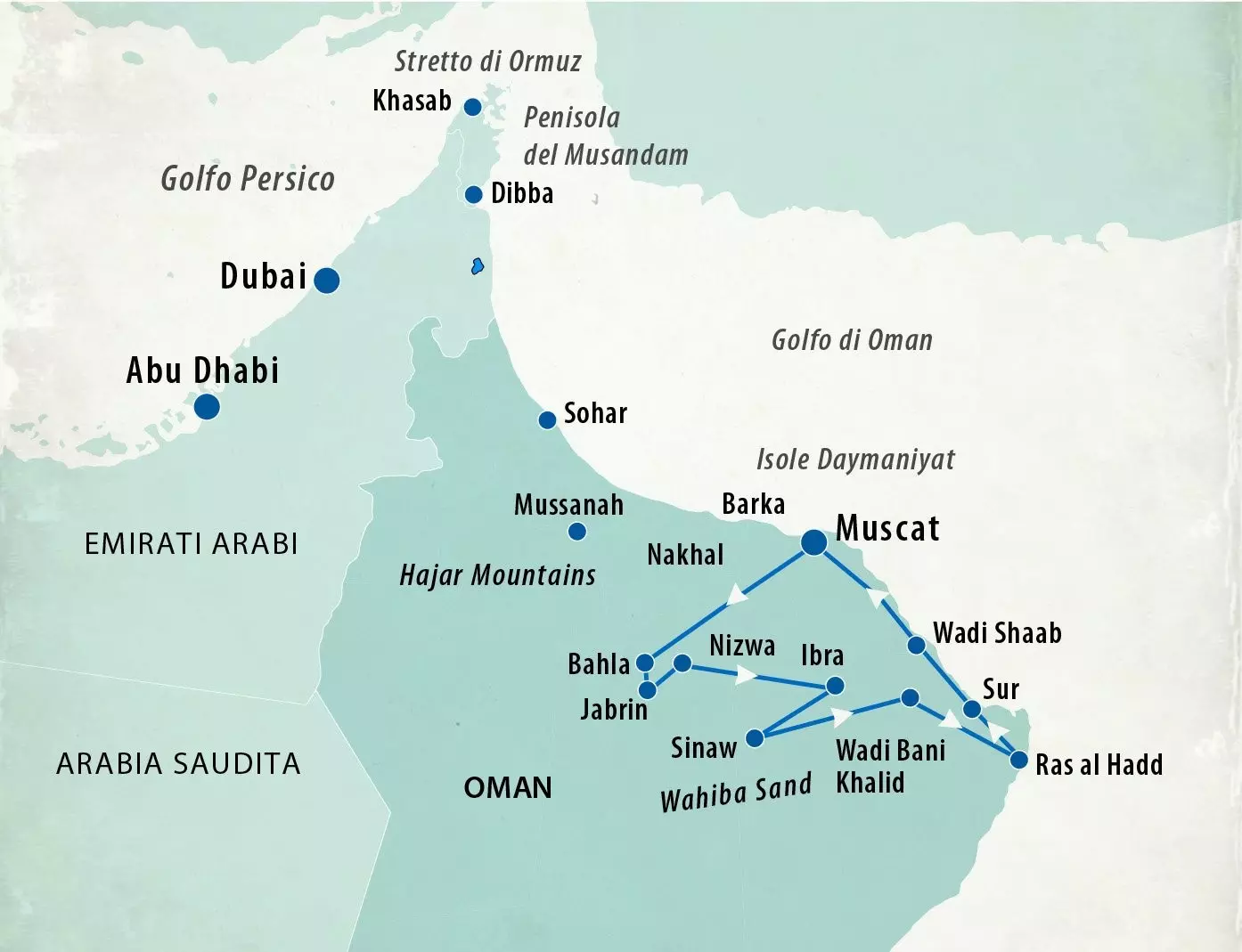 Trasferimento in auto 4x4 fino a Al Wasil, cambio del veicolo e proseguimento per Wadi Bani Khalid a bordo di van/minibus. Giunti a destinazione, visita di questa splendida oasi-wadi, attraversata da un corso d’acqua perenne che forma piccole cascate e laghetti circondati da palme. Sosta per il pranzo in ristorante locale. Proseguimento per Sur. All’arrivo, visita della città famosa per la miriade di piccole moschee, le tipiche porte intarsiate - retaggio del legame dell’Oman con l’Africa, e per i cantieri dove vengono costruiti i “dhow”, le tipiche imbarcazioni omanite. Cena in hotel. Dopo cena escursione sulla spiaggia per osservare