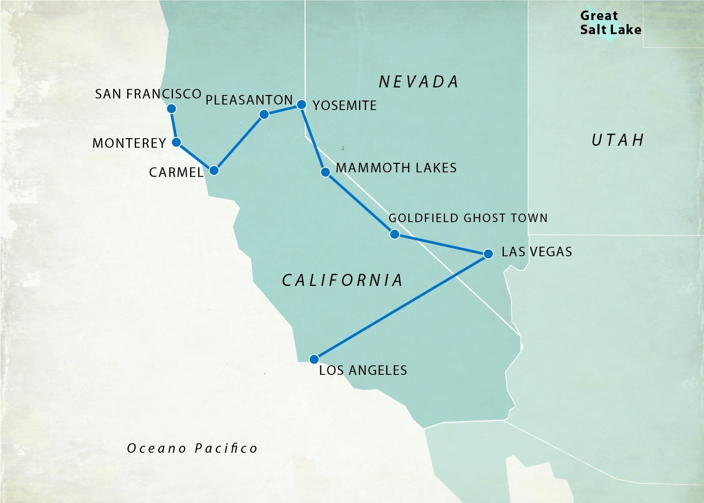 Nota: qualora il Passo del Tioga fosse chiuso, durante il periodo aprile/giugno, l’itinerario verrà modificato con un pernottamento a Bakersfield o Fresno. Nessuna visita di Amargosa Valley o Goldfield che saranno sostituire con una visita alla Calico Ghost Town.