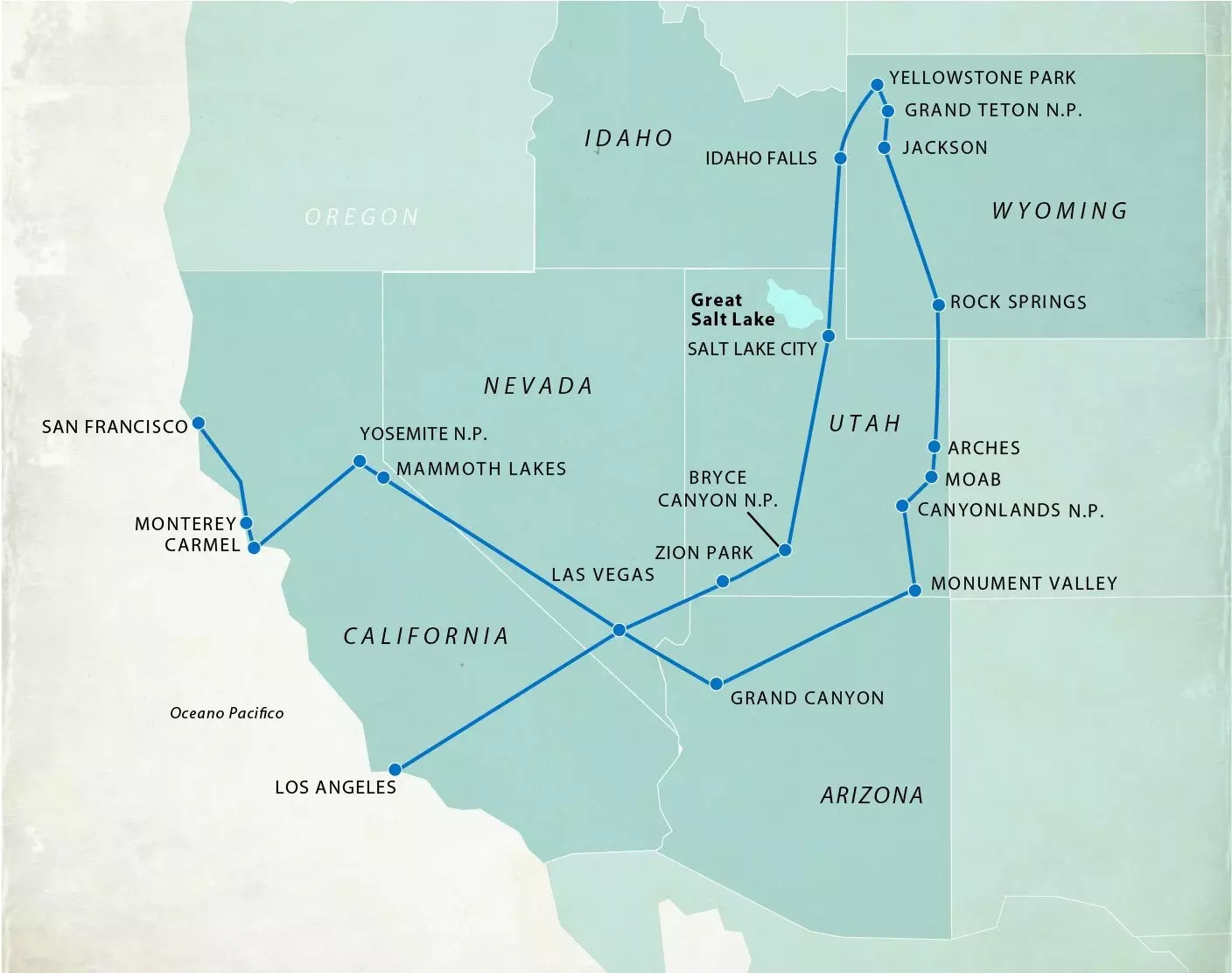 Los Angeles, Las Vegas, Grand Canyon, Monument Valley, Canyonlands N.P, Moab, Arches N.P., Rock Springs, Grand Teton N.P., Jackson Hole, Yellowstone N.P., Idaho Falls, Salt Lake City, Bryce Canyon N.P., Snow Canyon State Park., Las Vegas, Mammoth Lakes, Yosemite N.P., Carmel, 17-Mile Drive, Monterey, San Francisco