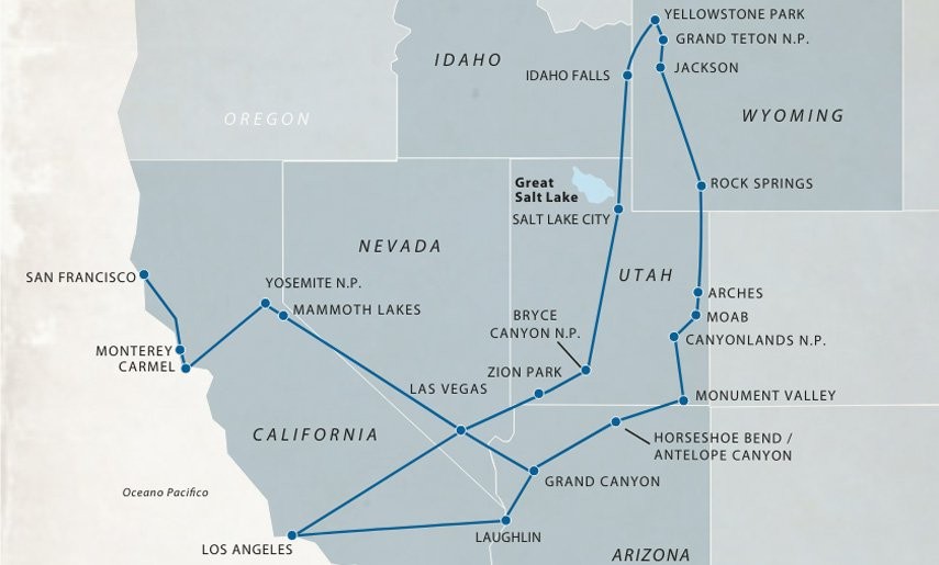 Los Angeles, Las Vegas, Grand Canyon, Monument Valley, Canyonlands N.P, Moab, Arches N.P., Rock Springs, Grand Teton N.P., Jackson Hole, Yellowstone N.P., Idaho Falls, Salt Lake City, Bryce Canyon N.P., Snow Canyon State Park., Las Vegas, Mammoth Lakes, Yosemite N.P., Carmel, 17-Mile Drive, Monterey, San Francisco